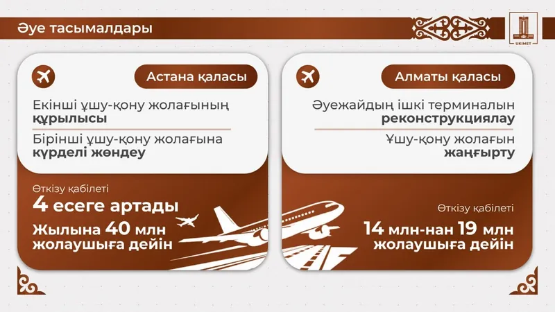 2026 жылы Үкімет 11 мың шақырым жолды жаңғыртып, әуежайлардың өткізу қабілетін 40 млн жолаушыға дейін арттырады.