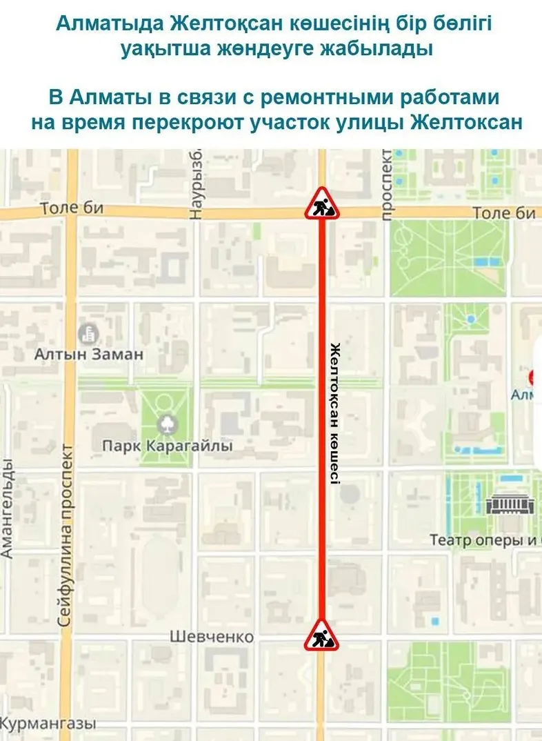 Қала әкімдігінің мәліметінше, 24 маусым күні сағат 08.00-ден 22.00-ге дейін Шевченко көшесінен Төле би көшесіне дейінгі аралықта қозғалыс уақытша жабылады. Бұл аумақты Абылай хан даңғылы мен Наурызбай батыр көшесі арқылы айналып өтуге болады.