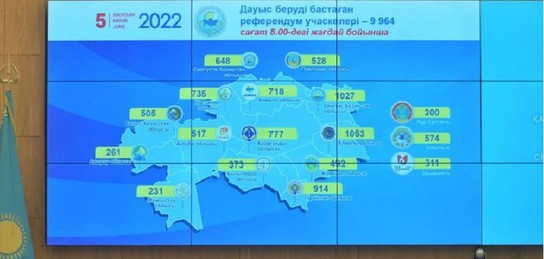 Сағат 08:00-дегі жағдай бойынша облыстардағы, сондай-ақ Алматы, Шымкент және Нұр-Сұлтан қалаларындағы комиссияларымыздан Қазақстан Республикасының барлық 9947 сайлау учаскелерінен, сондай-ақ 17 сайлау учаскелерінен онлайн режимінде келіп түскен мәліметтерге сәйкес 15 шет елдегі елдеріміздің дипломатиялық өкілдіктеріндегі станциялар. Орталық референдум комиссиясының хатшысы Мұхтар Ерман