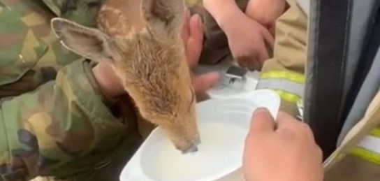 Видеодан өрт сөндірушілер жануардың көзін жуып, сүт беріп, орман шаруашылығы инспекторына тапсырғанын көруге болады.