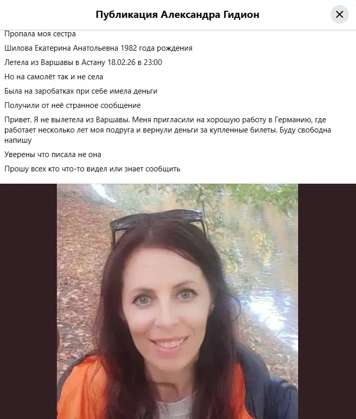 "Менің әпкем жоғалып кетті. Шилова Екатерина Анатольевна, 1982 жылы туған. 2026 жылғы 18 ақпанда сағат 23:00-де Варшавадан Астанаға ұшуы керек еді. Бірақ ол ұшаққа отырмады. Жұмыс бабымен жүрген, қолында ақшасы бар болатын", – делінген ақпаратта.