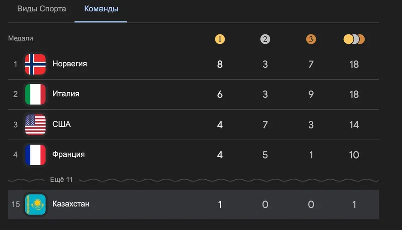 14 ақпандағы жағдай бойынша Қазақстан Италияда өтіп жатқан қысқы Олимпиада ойындарының медаль кестесінде 15-орынға көтерілді, деп хабарлайды Zakon.kz.
