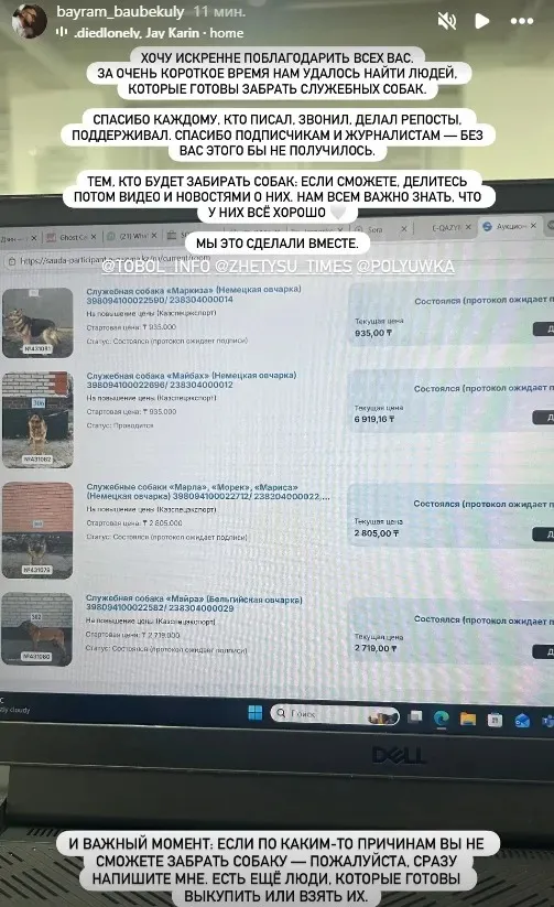 "Бейжай қарамайтын, иттерді қамқорлығына алуға ниетті жандан баршылық екен. Алайда, өкінішті-ақ, олар ертеңгі аукционға қатысу үшін тіркеліп үлгермейді. Сондықтан мен өзім қатысамын. Егер жеңіп шықсам, иттерді сенімхат арқылы жаңа иелеріне табыстаймын", – деп жазды ол 19 ақпанда.