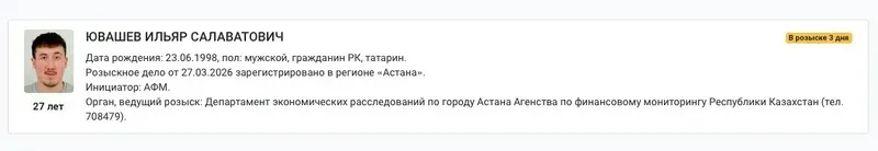 Іздестіру туралы іс 2026 жылғы 27 наурызда Астанада тіркелген. Іздеу салған орган – Қаржылық мониторинг агенттігі.