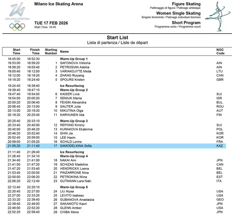 2026 жылғы Олимпиаданың алғашқы күні мәнерлеп сырғанаушы қыздардың бағдарламасына арналған кесте жарияланған болатын. Оған сүйенсек, Самоделкина 17 ақпан күні өнер көрсетеді.