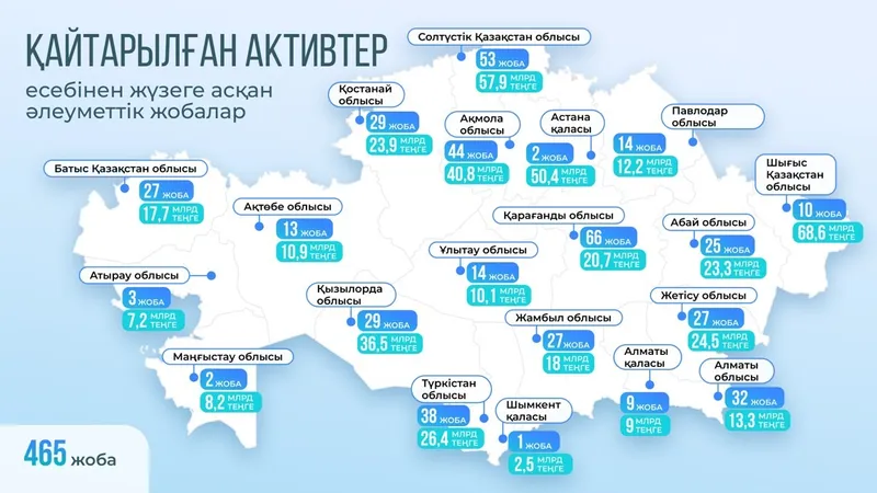Бұл ретте жаңадан салынған әлеуметтік және инфрақұрылымдық нысандардың бір бөлігі қайтарылған активтер есебінен қаржыландырылып жатқанын атап өту аса маңызды. Өйткені бұл бюджетке салмақ салмай, өткір проблемаларды жедел шешуге мүмкіндік берді.