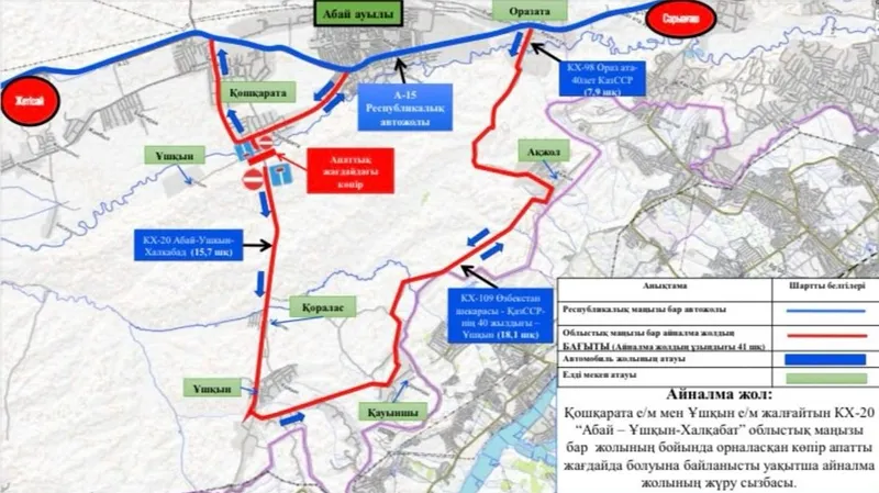 "Тұрғындар мен жол қозғалысына қатысушылардың қауіпсіздігін қамтамасыз ету мақсатында Алпамыс батыр және Біртілек ауылдық округтері арқылы өтетін 10–15 шақырымдық айналма жол қаралды. Қазіргі уақытта көлік қозғалысы осы балама бағыт арқылы жүзеге асырылуда. Жол белгілері орнатылып, тиісті қызметтер тарапынан бақылау күшейтілді. Жүргізушілерден уақытша қолайсыздықтарға түсіністікпен қарап, көрсетілген айналма жолды пайдалануды сұраймыз", делінген әкімдік хабарламасында.