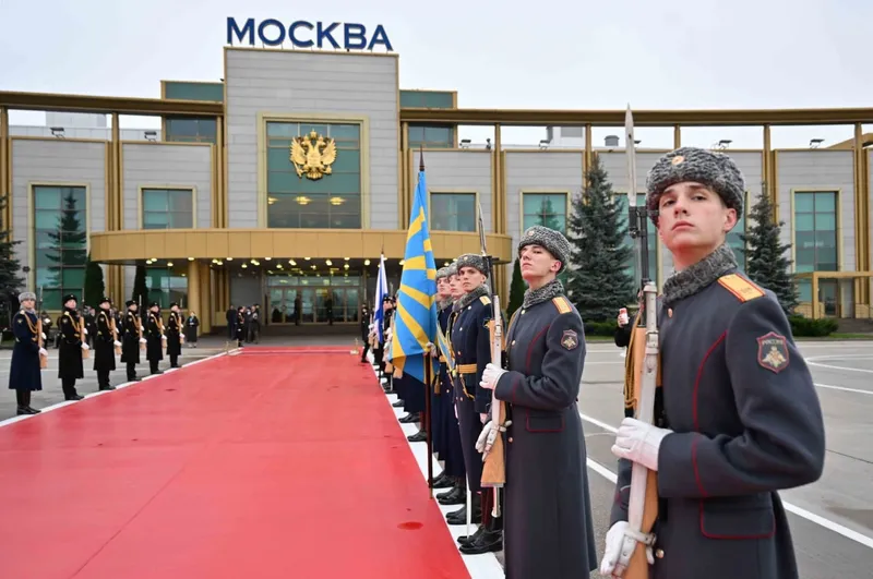 Внуково-2 әуежайында мәртебелі мейманның келуіне орай Мәскеу гарнизонының құрмет қарауылы мен әскери үрмелі оркестрі сап түзеді.