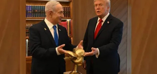 Израиль премьер-министрі Беньямин Нетаньяху АҚШ президенті Дональд Трампқа ХАМАС-пен бітімге келгеннен кейін алтын көгершін мүсіншесін сыйға тартты, деп хабарлайды Zakon.kz.