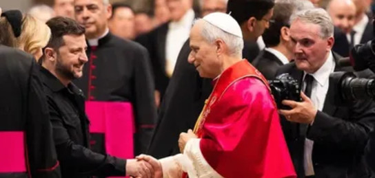 Жаңа Рим Папасы - XIV Лео 18 мамырда өткен таққа отырғызу рәсімінен кейін бірден Украина президенті Владимир Зеленскиймен кездесу өткізді, деп хабарлайды Zakon.kz.