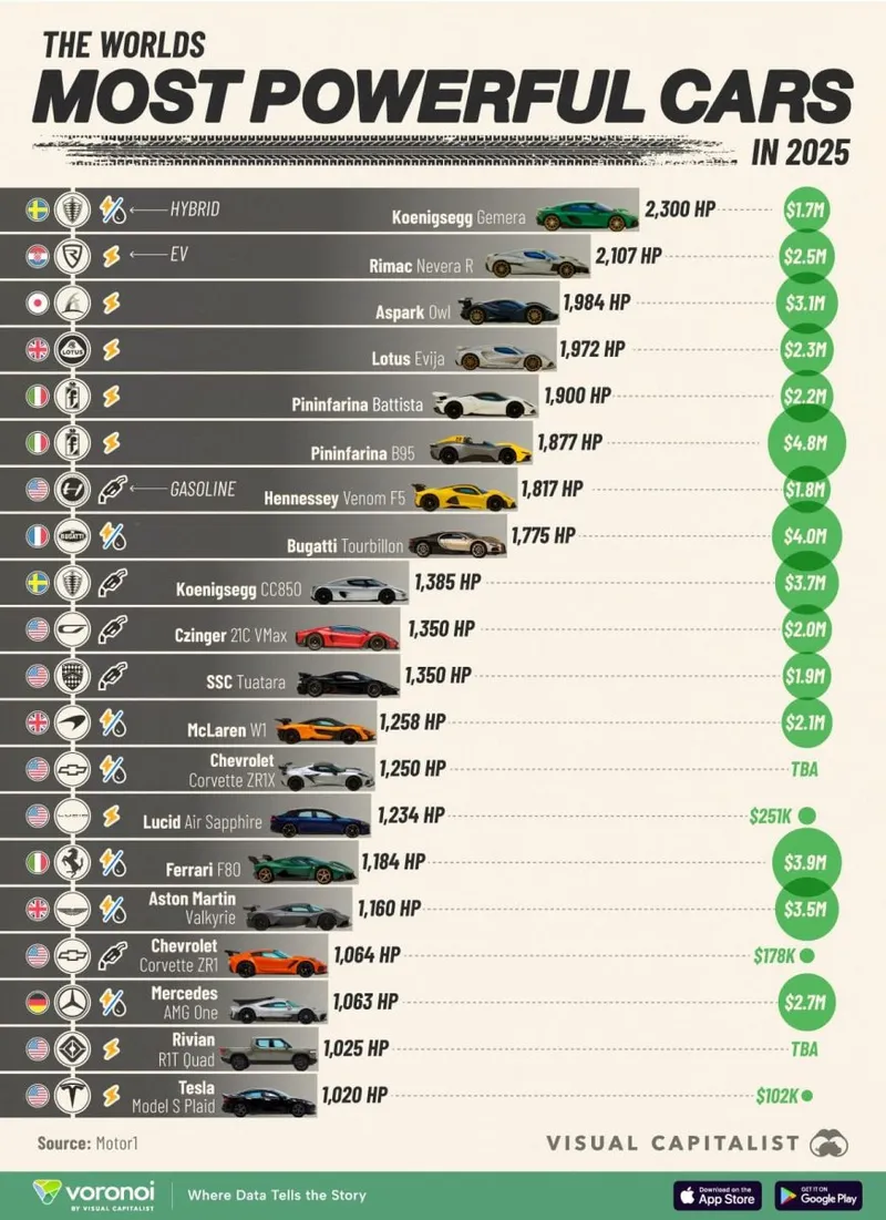В инфографике, составленной по данным автомобильного медиаресурса Motor1, количество лошадиных сил, которое могут генерировать современные автомобили, поистине впечатляет.