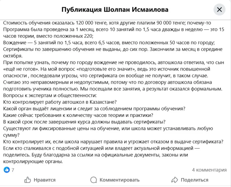 На недобросовестные автошколы жалуются и клиенты. Жительница Алматы Шолпан Исмаилова рассказывает: ее сын отучился на водителя в октябре, но свидетельство о прохождении курсов до сих пор не получил и качеством обучения остался недоволен.