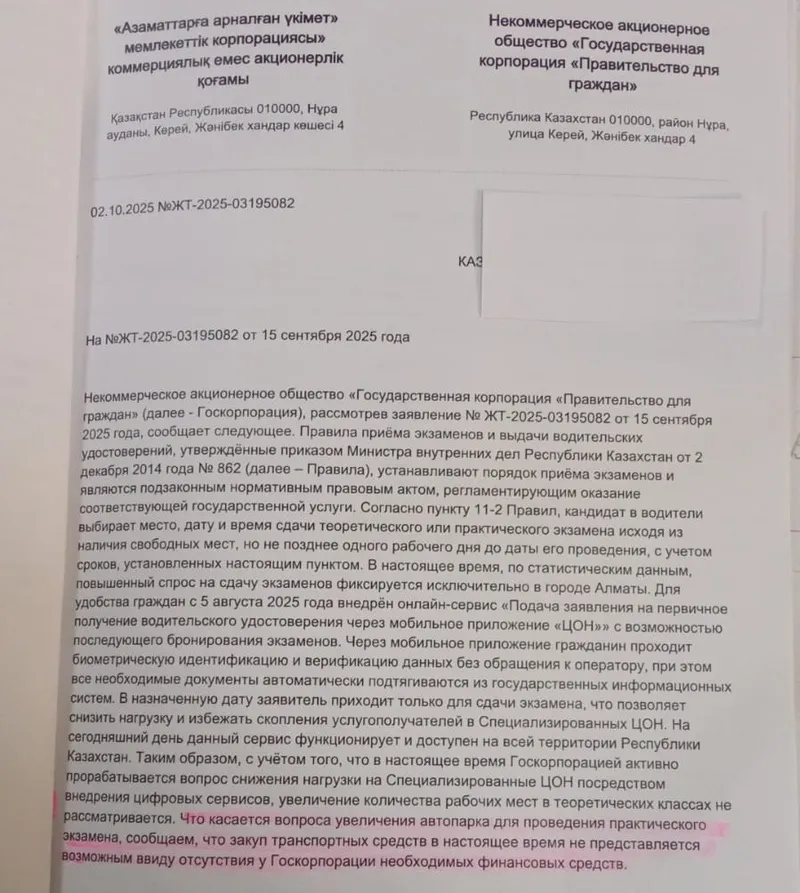 В ответ на официальное обращение автошкол насчет увеличения автопарка для проведения практического экзамена в НАО "Правительство для граждан" сообщили: закупить дополнительные машины сейчас невозможно из-за нехватки финансирования.