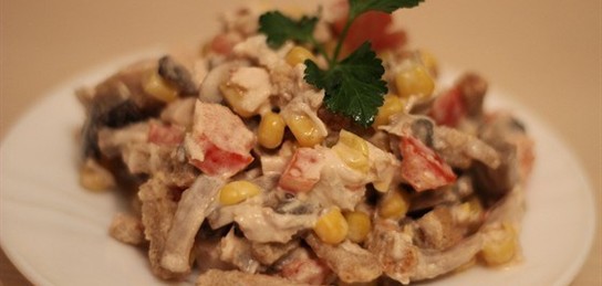 Сварить куриные грудки и порезанные шампиньоны. Мелко нарезать и переложить в миску. Добавить банку кукурузы. Затем — две пачки сухариков (лучше просто с солью). Вмешать мелко порезанные помидоры. Добавить майонез и аккуратно перемешать.