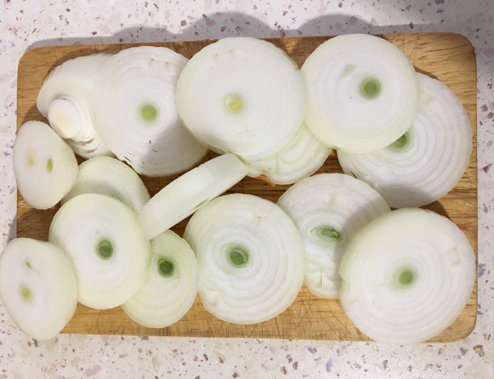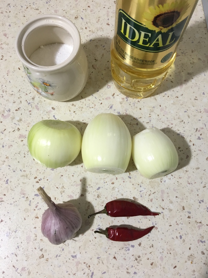 И снова сверху лук, соль по вкусу, порезанный чеснок и перец чили.
