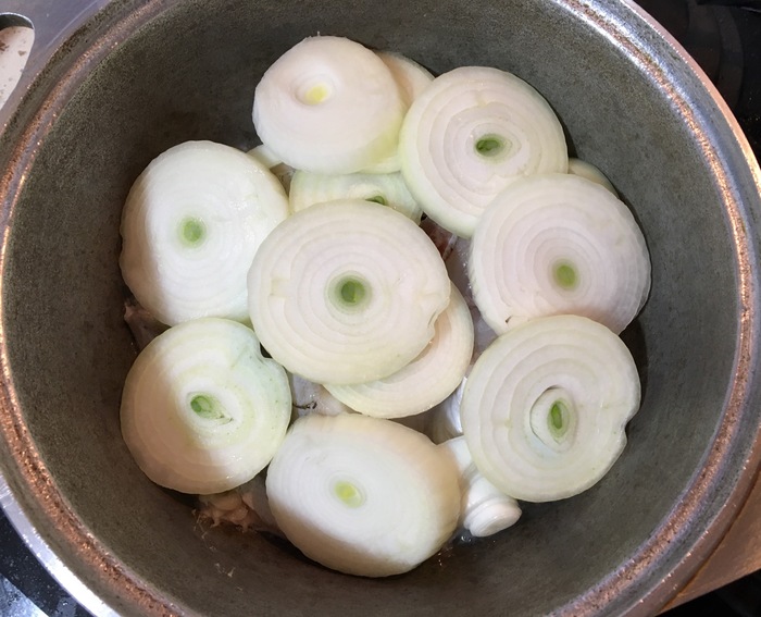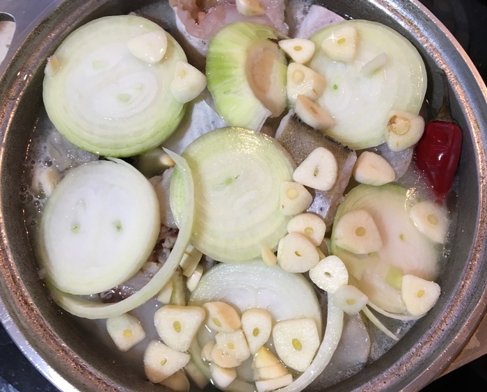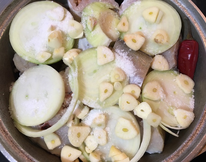 Как только мы выложили наш «бутерброд», добавляем горячей кипяченой воды так, чтобы слегка закрывало рыбу.