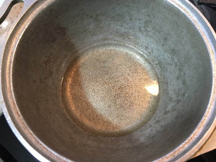 В казанок, предварительно разогретый, наливаем растительное масло, грамм 100-150 и раскаляем его.