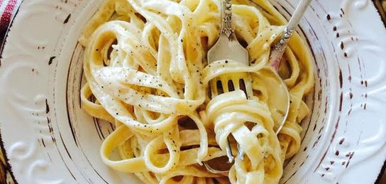 Добавляем еще воды, если это необходимо. Вода от пасты поможет придать блюду более мягкий и сливочный вкус. Мешаем пасту около 3 минут. (Для более быстрого приготовления можно смешать воду и масло на тонкой сковороде и довести до кипения, а потом кинуть туда пасту и пармезан, помешивать около 2 минут). Подаем фетучини горячей на теплых тарелках.