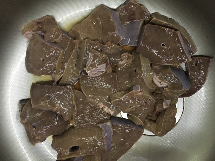 Первым делом вымачиваем печень в воде (около 5 часов), потом воду сливаем, режем большими кусками.