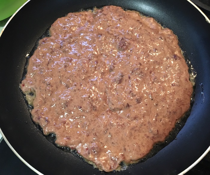 Когда тесто готово, берём половник и на сковородку, смазанную растительным маслом, начинаем заливать наши «блины» и жарить коржи с двух сторон.
