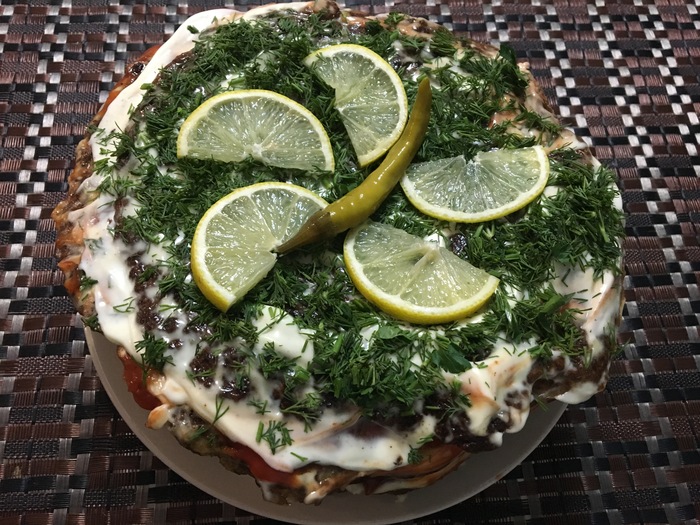Ну а последний корж смазываем, помимо перечисленного, кетчупом и посыпаем зеленью. В общем украшаем, кто как может и у кого откуда руки растут.
