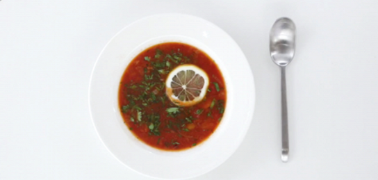 Мелко нарубленный лук обжарить в глубоком сотейнике на оливковом масле с тертым имбирем, молотой корицей, семенами тмина (или зиры). Обжаривать до сильного запаха жареного лука и специй, но не пережечь. Угля не нужно. Помидоры мелко нарезать (можно избавиться предварительно от кожицы и семян, но это для слишком деликатных поваров) и добавить к луку. Туда же влить куриный бульон, заправить содержимое сотейника медом, одной чайной ложкой рубленой петрушки, одной чайной ложкой рубленой кинзы, посолить, поперчить, ­довести все это до кипения, убавить огонь и томить едва булькающую гущу несколько минут, время от времени помешивая. Снять суп и охладить его в раковине, наполненной водой и льдом. После чего влить в суп столовую ложку лимонного сока, бросить остатки нарубленных петрушки и кинзы, перемешать и разлить по тарелкам, положив в каждую тонкий ломтик лимона или лайма.