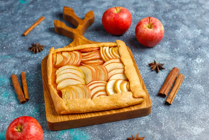 Оставшиеся два яблока порезать тонкими дольками предварительно очистив от сердцевины. Раскатать размороженное тесто по размеру формы для выпечки пирога плюс 2 см. Выложить тесто в форму, распределив "лишнее" тесто по периметру края. Выложить на тесто приготовленную основу-начинку, и разровнять. Сверху выкладываем кружки яблок от краев к центру по кругу. Дольки должны плотно прилегать друг к другу. Выпекать при температуре 170-180 градусов около 30-40 минут.