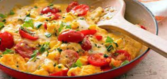 Яичница с жареным сулугуни и помидорами