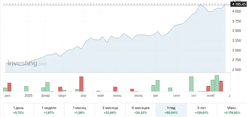 За прошедший год золото подорожало в цене больше, чем в полтора раза. Если в начале января 2025 года унция золота (31,1034768 граммов) стоила 2 661 долларов, то сегодня ее цена 4195 долларов, сообщает Zakon.kz.