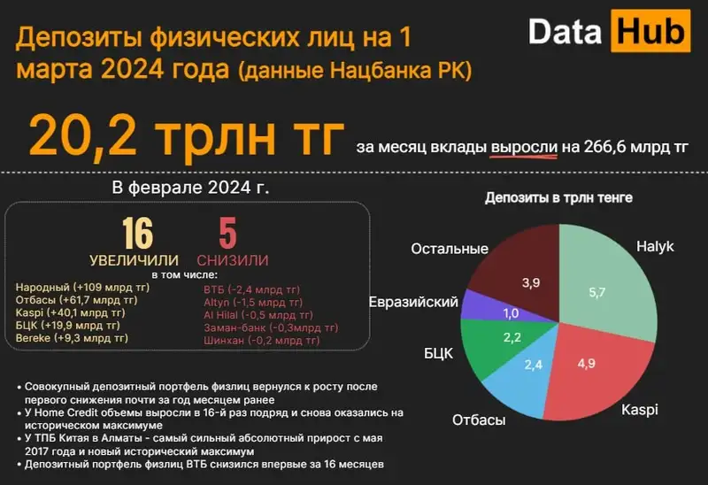 Примечательно, что депозитный портфель юрлиц растет третий месяц подряд. В феврале он увеличился на 2,2% и составил 15 трлн тенге.