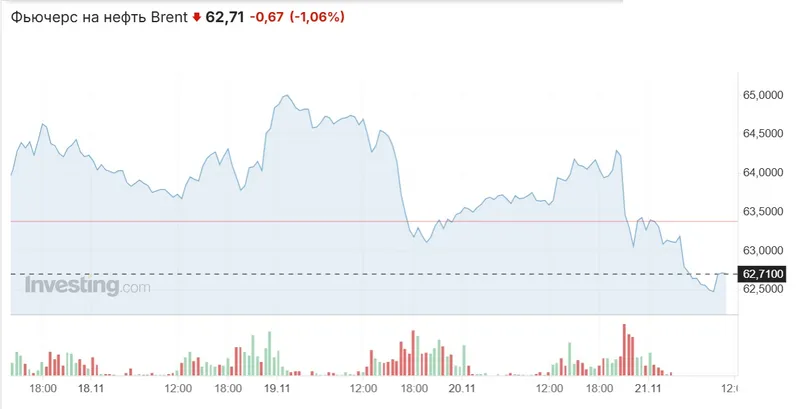 В итоге на 11 утра 21 ноября 2025 года по времени Астаны фьючерс нефти Brent на бирже ICE Futures Europe торговался по 62,71 доллара за баррель. Суточное падение составило 1,14%, а недельное – 2,69%.