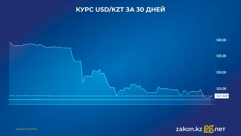 За прошедший месяц курс доллара к тенге снизился на 2,32%, упав с отметки 536,32 тенге до 524,14 тенге за доллар. Этому краткосрочному укреплению способствовали как внутренние технические факторы, так и активные операции регулятора.
