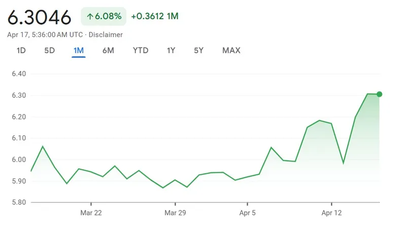 Март 2025 года: восходящий импульс сохранился, и курс достиг примерно 6,00 тенге за рубль к концу месяца, после старта около 5,64.