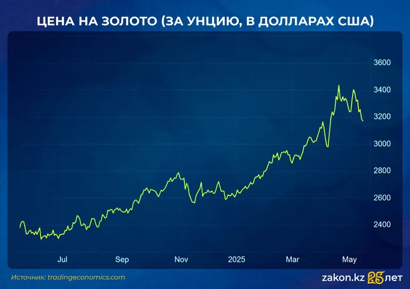 На текущей неделе, стоимость золота на мировом рынке упала, более чем на 3%. В пятницу стоимость за унцию снизилась до 3200 долларов. Для сравнения, на прошлой неделе цена драгметалла превышала 3300 долларов за унцию. Отметим, что в апреле цена на золото достигла очередного исторического максимума, подорожав более, чем до 3400 долларов.