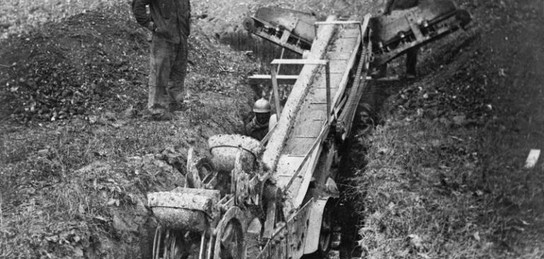 Герой сегодняшнего материала - французский траншеекопатель, зафиксированный на пленке где-то в Шампани примернов 1916-1917 годах. Чем именно он интересен? Тем, что в отличие от других известных механических траншеекопателей Первой Мировой он планировался менее заметным для вражеских наблюдателей. И, соответственно, с гораздо меньшей вероятностью привлекал к себе их внимание и артиллерийский огонь. А копал со скоростью тренированной роты саперов, если не быстрее. В августе 1916 года французская армия успешно использовала два таких траншеекопательных экскаватора, способных вырыть траншею глубиной до 1,8 м и шириной 0,6 м со скоростью 20 метров в час. Эти машины испытывались в местности с меловыми породами, и успех испытаний оказался достаточным, чтобы оправдать принятие подобных машин в тех корпусах, которые действовали в районах с подобными видами почв.