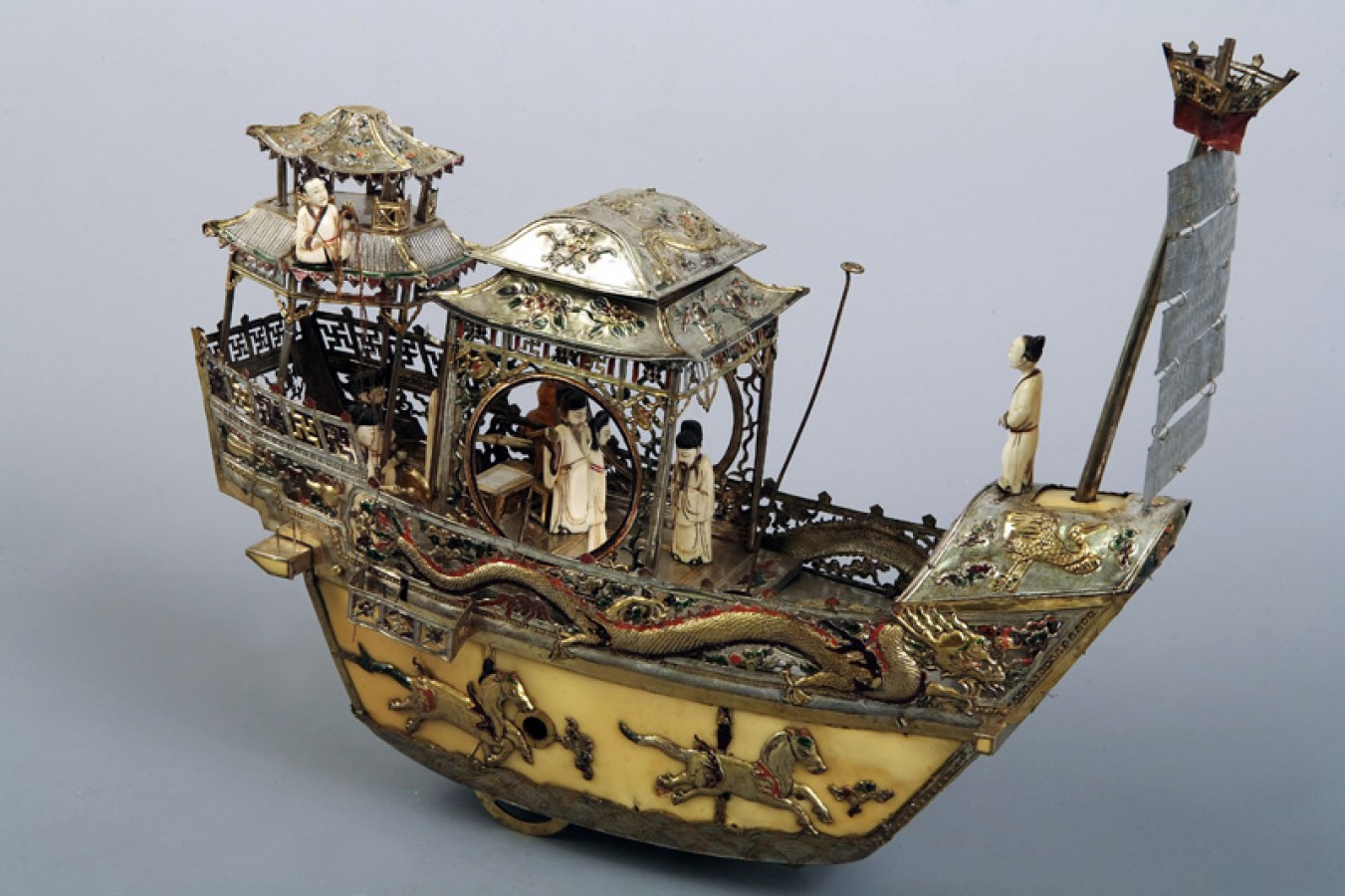 Эта механическая игрушка изображает небесный кораблик, на котором божество (из янтаря), окруженное танцовщицами и музыкантами (из слоновой кости) путешествует по морям и океанам. Механизм ладьи заводится с помощью ключа — корабль движется, а слуги танцуют и музицируют.