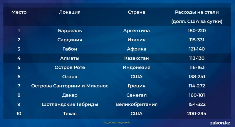 Алматы сохраняет баланс между качеством и стоимостью: проживание в алматинских гостиницах варьируется в пределах 113-130 долларов США за сутки. Для сравнения: проживание в лидере рейтинга – аргентинском Барреале – обойдется в 180-220 долларов США.