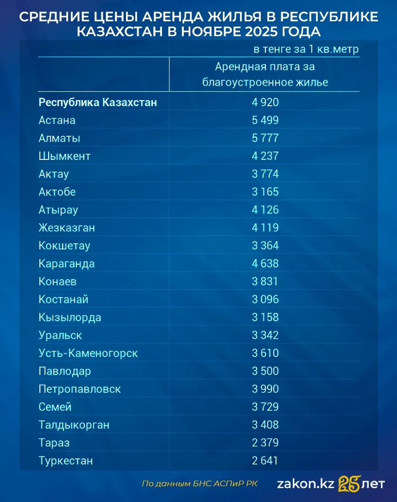 По состоянию на ноябрь 2025 года, средняя цена аренды благоустроенного жилья по стране достигла 4 920 тенге за квадратный метр. Годовой рост составил 11,9%, а динамика с декабря 2020 года равна 106,8%.