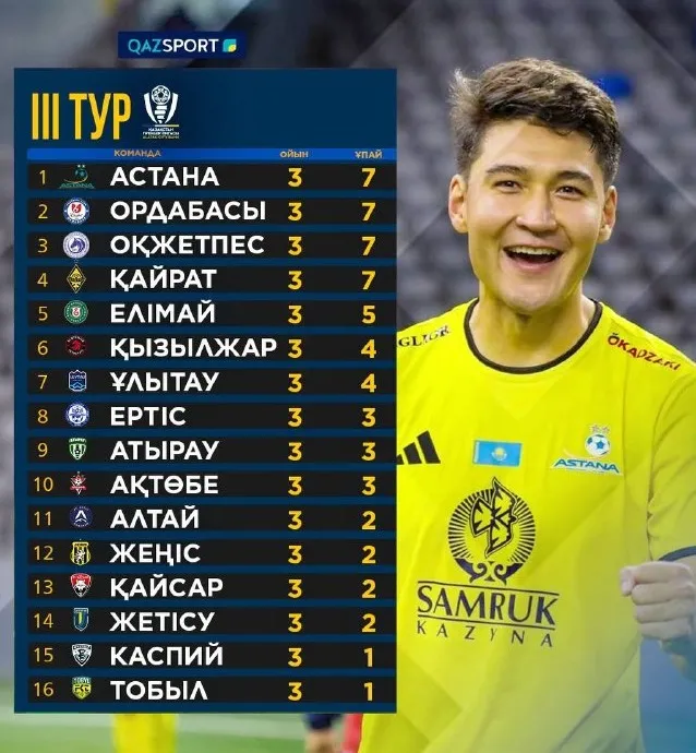 Также по семь очков имеют "Ордабасы", "Окжетпес" и "Кайрат", но все они уступают "Астане" по разнице забитых и пропущенных мячей.