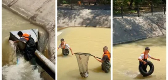 Автор показал в видео не только самоотверженный труд студентов, а также сложную и опасную работу гидротехников. Из быстрого течения и большого потока воды ребята вынесли но только мелкий мусор, в частности пластик, но и резиновые шины от колеса авто.