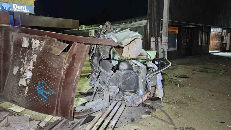 Передняя часть автомобиля улетела на тротуар и снесла остановочный комплекс.