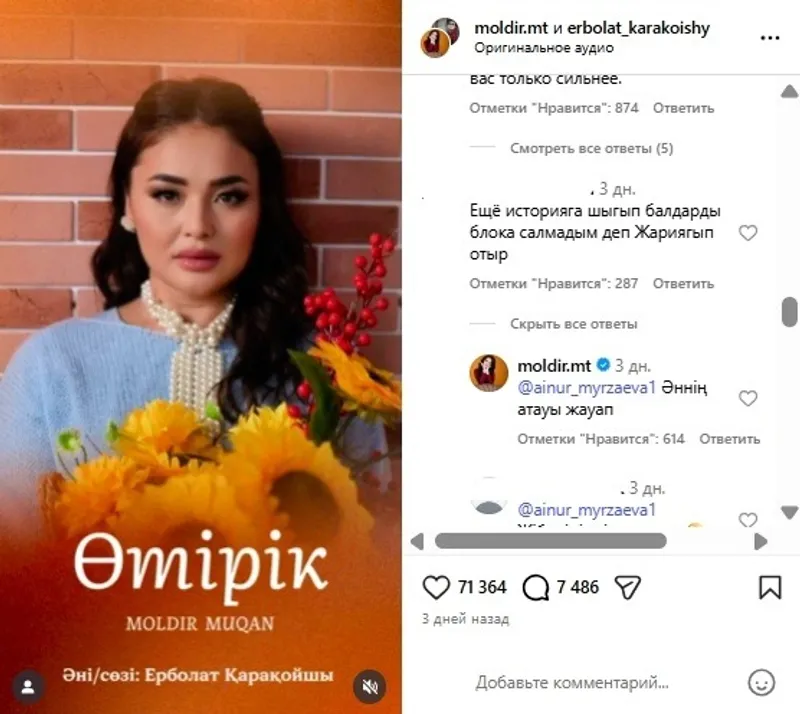 "Ответ на это – название песни", – ответила подписчице Муканова, имея ввиду, что бывший муж лжет.