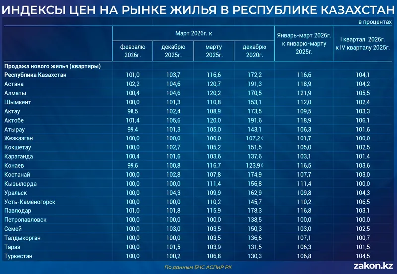 Стоимость нового жилья в Казахстане за год выросла на 16,6%, но в марте прибавка составила лишь 1,0% – рынок выходит из фазы резкого роста и переходит к стабилизации. В каком регионе страны новостройки продолжают дорожать, а где рынок остановился, выяснял Zakon.kz.