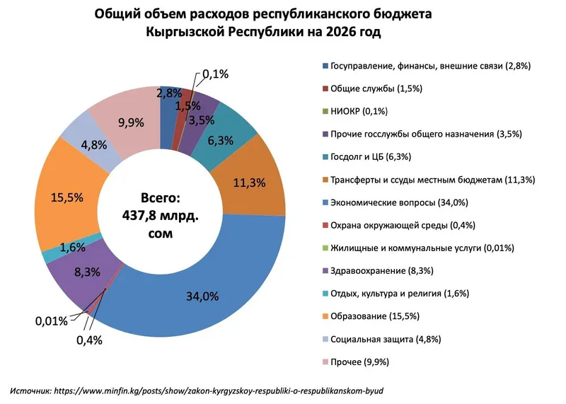 Кыргызстан остается предпринимательским – 36% расходов идет на экономическое развитие, при этом доля социальных направлений (28,8%) тоже значительна.