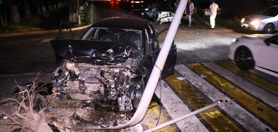 Volkswagen сбил дерево, дорожный знак и остановился, врезавшись в фонарный столб.