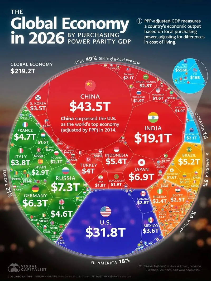 В рейтинге МВФ (визуализация: Visual Capitalist) используется показатель ВВП по паритету покупательной способности (ППС). Он сравнивает страны не по номинальным деньгам, а по тому, сколько товаров и услуг стоит за этими деньгами внутри экономики.