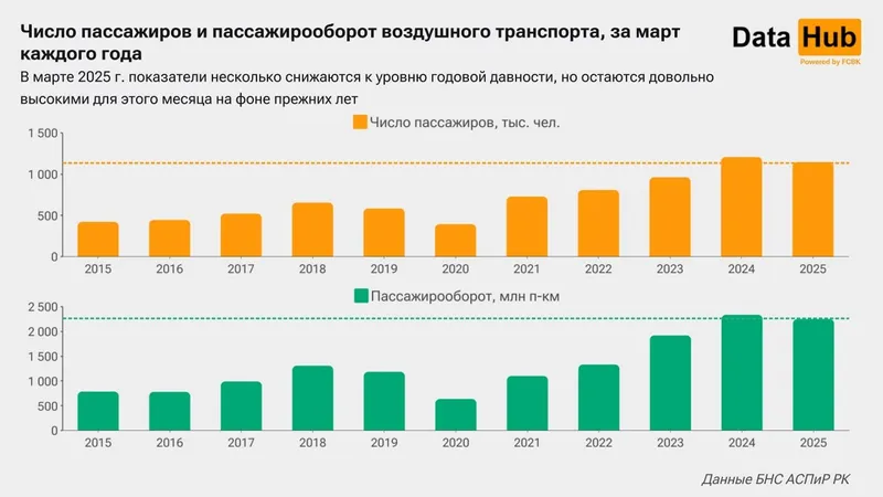 В марте 2025 года предприятия воздушного транспорта получили от пассажиров за перелеты 60,3 млрд тенге. По сравнению с мартом 2024 года показатель снизился сразу на 18,4%. Такие темпы падения в годовом выражении стали самыми ощутимыми с декабря 2023 года, отмечают аналитики Первого Кредитного Бюро.