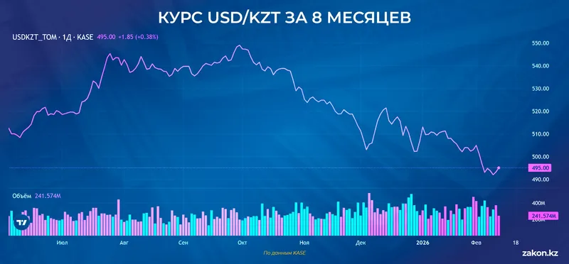 Официальный курс доллара на 13 февраля составляет 494,28 тенге. Это один из самых низких уровней с начала года. Но 10 февраля был зафиксирован абсолютный годовой минимум - 491,88 тенге. Ниже доллар опускался только 12 марта 2025 года – до 488,53 тенге, сообщает Zakon.kz.