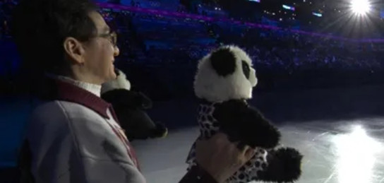 Во время выхода казахстанца на лед в образе панды, актер стоял за бортом, держа в руках двух плюшевых панд.