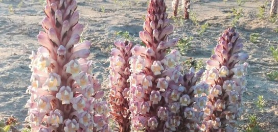Это многолетнее с толстым стволом растение, на котором распускаются лепестки небольших цветов, в закрытом виде они напоминают чешуйки. Многие туристы, увидев такое творение, удивляются, чем оно питается, произрастая в песке. Оказывается, эти цветы пустыни не совсем самостоятельные, они обеспечивают себе жизнь, паразитируя на корнях кустарников и полукустарников, именно с их корней они забирают всю влагу. Всего известно 27 видов цистанхе. На территории бывшего СССР произрастают семь разновидностей. А в Мангистауском регионе их обитают два вида: сомнительная и солончаковая цистанхе. Как видно на фото, это сомнительная цистанхе бледно - сиреневого цвета растет у кустарников, и в основном оно паразитирует на корнях саксаула.